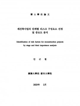 • 재건축사업의 단계별 리스크 구성요소 선정 및 중요도 분석 안근철(2023) 박사학위논문