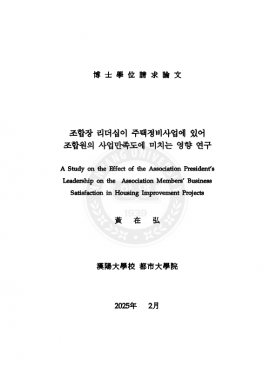• 조합장 리더십이 주택정비사업에 있어 조합원의 사업만족도에 미치는 영향 연구 황재홍(2025) 박사학위논문