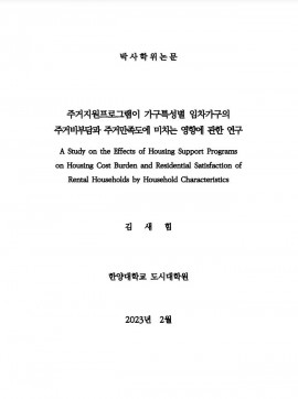 • 주거지원프로그램이 가구특성별 임차가구의 주거비부담과 주거만족도에 미치는 영향에 관한 연구 김새힘(2023) 박사학위논문