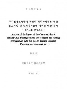 • 주차전용건축물의 특성이 비주차시설로 인한 용도복합 및 주차잠식률에 미치는 영향 분석 : 경기도를 중심으로 정재영(2023) 박사학위논문