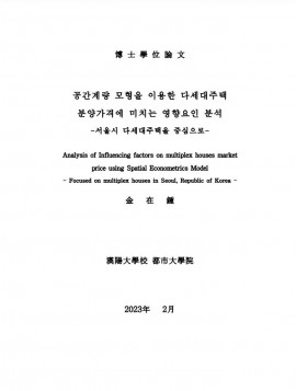 • 공간계량 모형을 이용한 다세대주택 분양가격에 미치는 영향요인 분석 : 서울시 다세대주택을 중심으로 김재종(2023) 박사학위논문