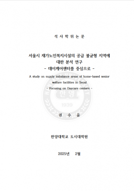 • 서울시 재가노인복지시설의 공급 불균형 지역에 대한 분석 연구 -데이케어센터를 중심으로 - 권수윤(2025) 석사학위논문