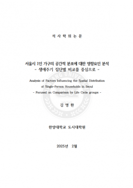 • 서울시 1인 가구의 공간적 분포에 대한 영향요인 분석 - 생애주기 집단별 비교를 중심으로 - 김명환(2025) 석사학위논문