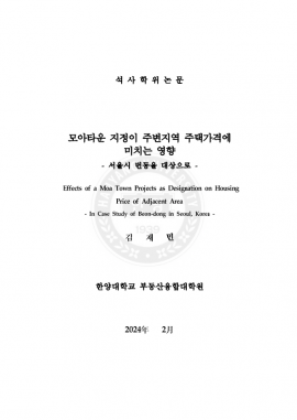 • 모아타운 지정이 주변지역 주택가격에 미치는 영향 : 서울시 번동을 대상으로 김재민(2024) 석사학위논문
