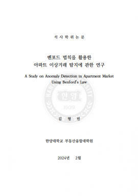 • 벤포드 법칙을 활용한 아파트 이상거래 탐지에 관한 연구 김형빈(2024) 석사학위논문
