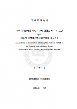 • 주택재개발사업 사업기간에 영향을 미치는 요인 분석 - 서울시 주택재개발사업구역을 중심으로 - 송민준(2025) 석사학위논문
