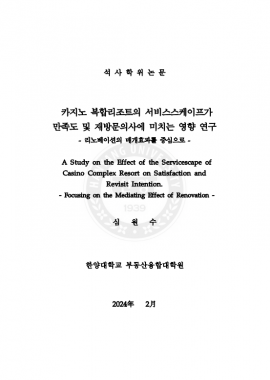 • 카지노 복합리조트의 서비스스케이프가 만족도 및 재방문의사에 미치는 영향 연구 : 리노베이션의 매개효과를 중심… 심원수(2024) 석사학위논문