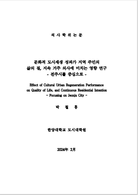 페이지 정보 본문 [문화적 도시재생 성과가 지역 주민의 삶의 질, 지속 거주 의사에 미치는 영향 연구 : 전주시를 중심으로] 박철홍(2024) 석사학위논문 관련링크 이전글 다음글 목록