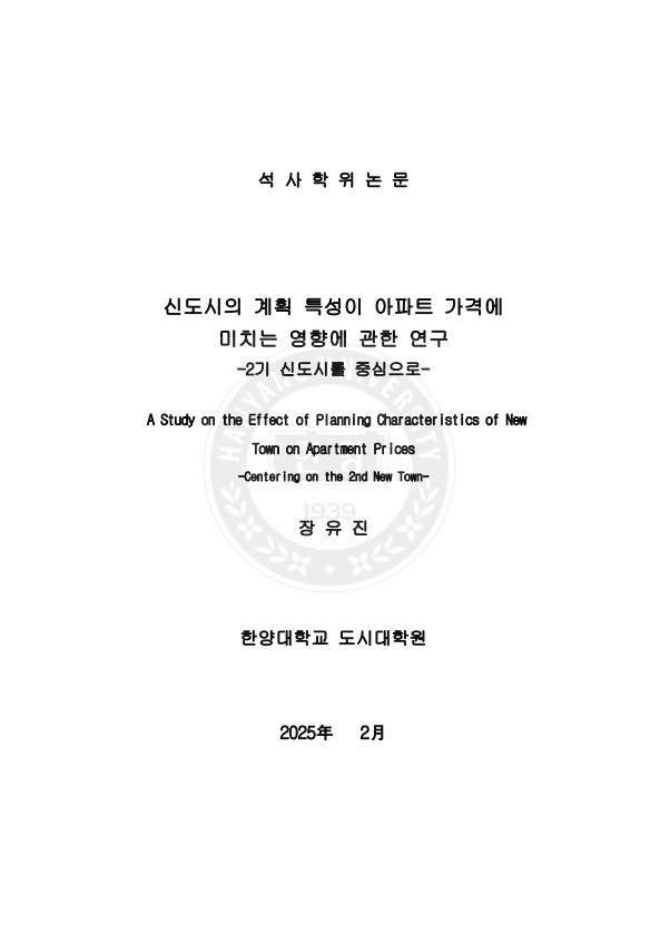 신도시 계획 특성이 아파트 가격에 미치는 영향에 관한 연구 - 2기 신도시를 중심으로 - > thesis_master